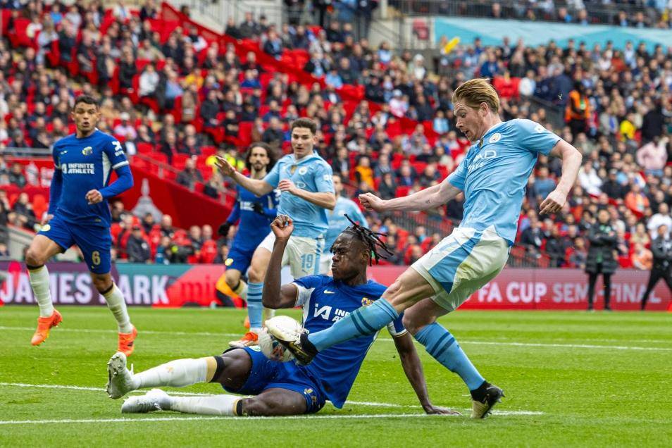 德布劳内威胁并不大的传球让切尔西后防一片混乱,周中欧冠点球大战射失点球的贝尔纳多迎球怒射,皮球击中库库雷利亚后折射入网。切尔西,卒……